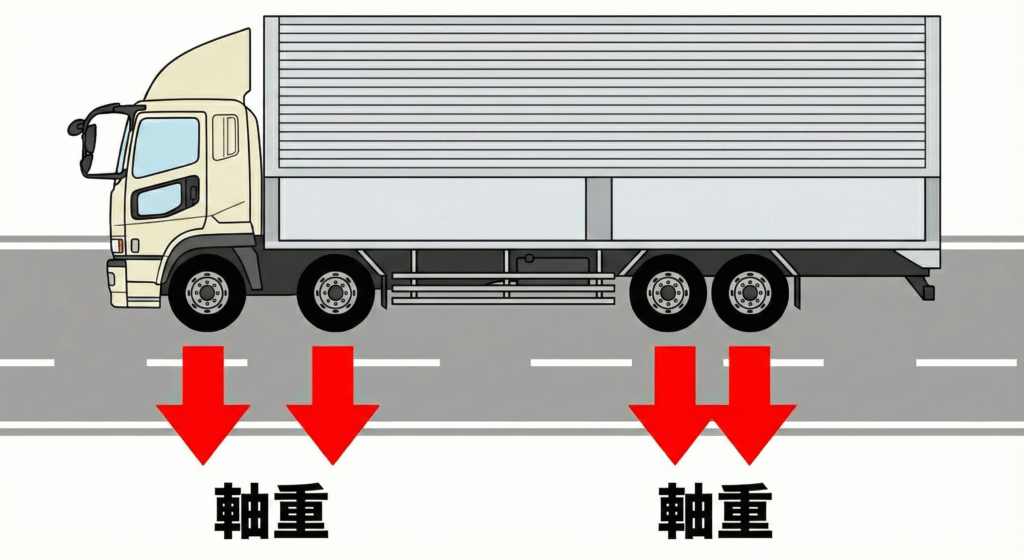軸重とは、車両の一つの車軸(アクスル)が路面に加える垂直荷重の合計のことです。簡単に言えば、タイヤとタイヤをつなぐ軸一本にかかる重さを指します。