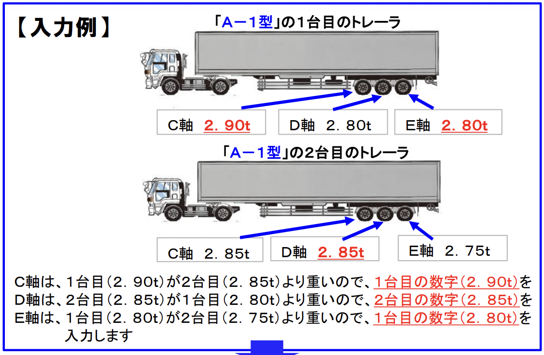 トレーラーの場合は、各型式ごと、各軸ごとの最も重い軸重の数値を入力します。