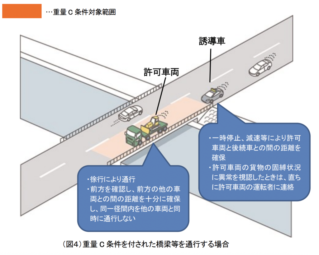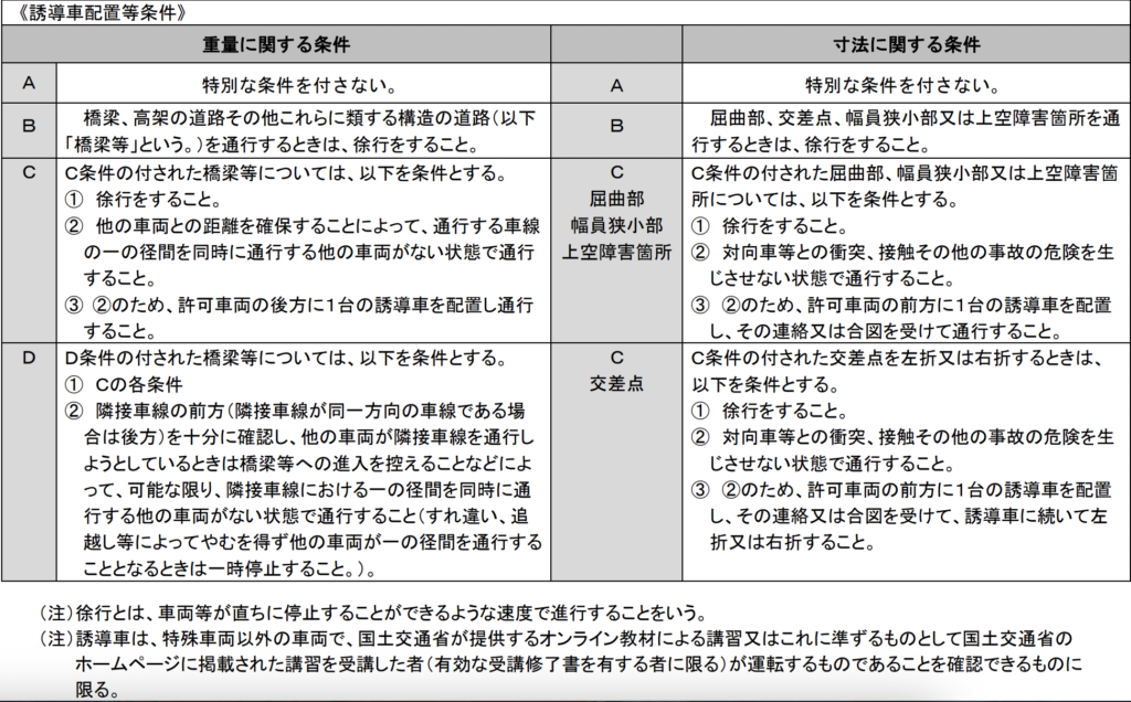 - 重量条件と寸法条件の両方が付された箇所: この場合は、改正後も引き続き車両の前後に誘導車を配置する必要があります。